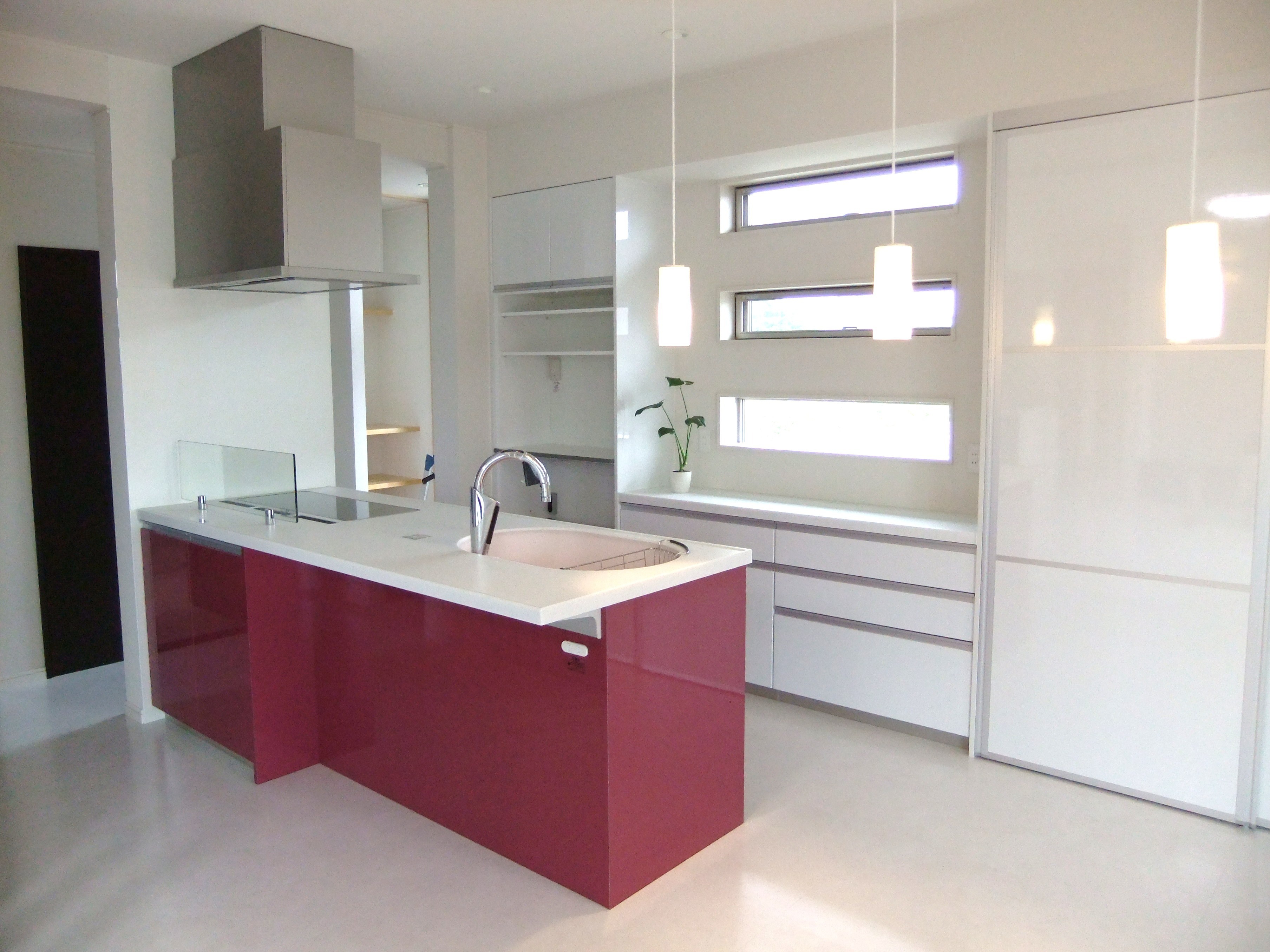 奥様こだわりの広々としたオープンキッチン。 鮮やかな色がすてきです。